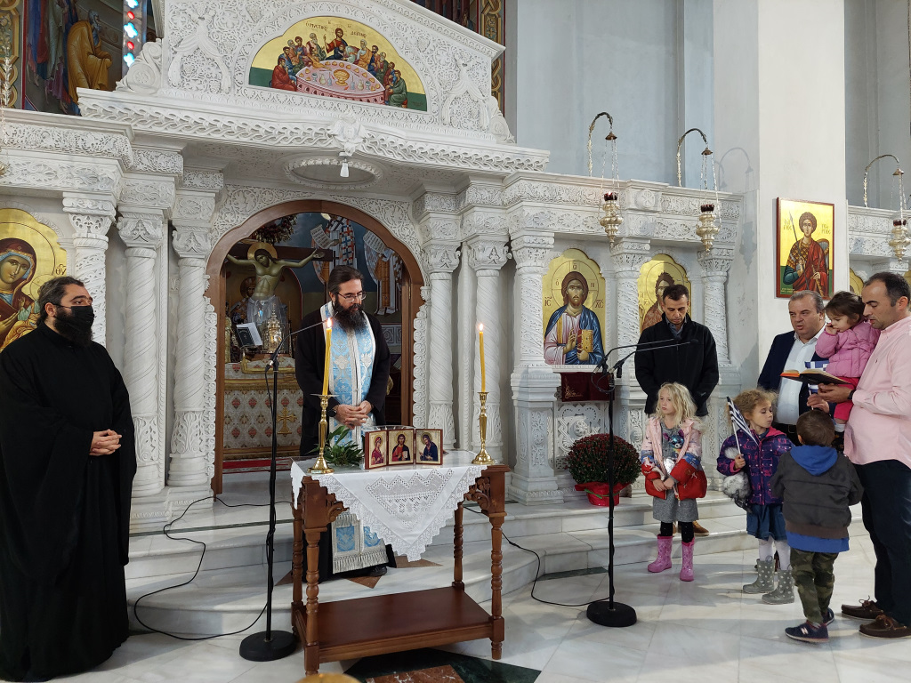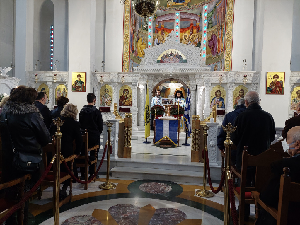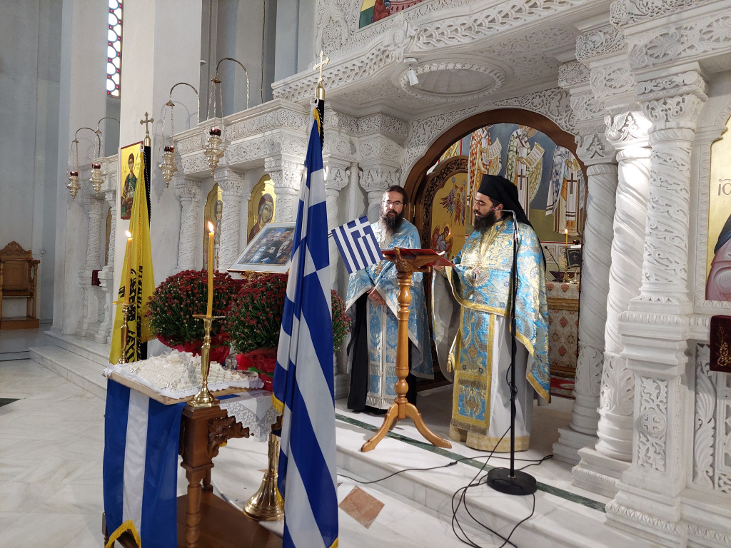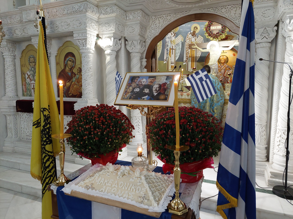 Αμέσως μετά τη δεύτερη θ. Λειτουργία τελέστηκε Δοξολογία από τους Πατέρες του Ναού, οι οποίοι στο τέλος μαζί με τον ευσεβή Λαό που μετείχε έψαλλαν τον Εθνικό Ύμνο και τραγούδησαν το γνωστό εμβατήριο «Μακεδονία ξακουστή…», με τις παιδικές φωνές να ξεχωρίζουν και να στέλνουν το μήνυμα της ελπίδας και της διαφύλαξης της πολύτιμης παρακαταθήκης των προγόνων μας.