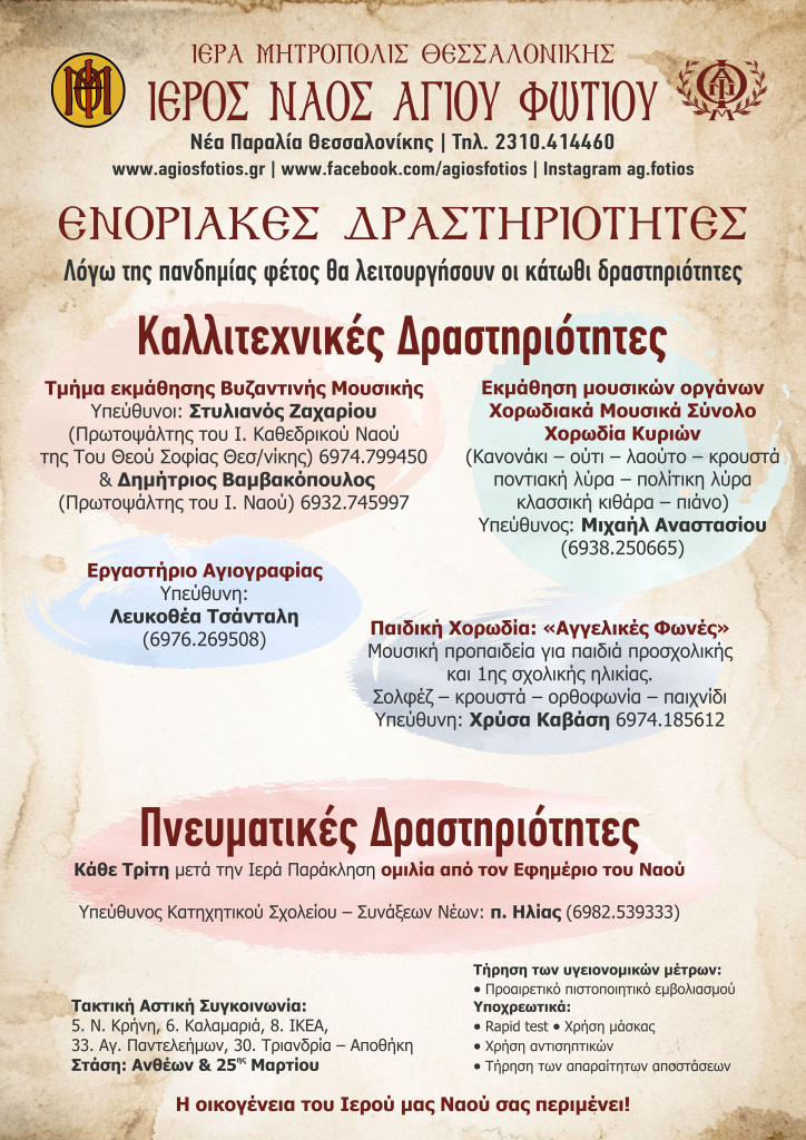 Μετά τη Θ. Λειτουργία τελέστηκε αγιασμός για την έναρξη των ενοριακών, πνευματικών και καλλιτεχνικών δραστηριοτήτων, παρουσία όλων των υπευθύνων των Τμημάτων, καθώς και των νέων κατηχητών και κατηχητριών, που θα λειτουργήσουν φέτος, μετά την αναγκαστική αναστολή λόγω της πανδημίας.