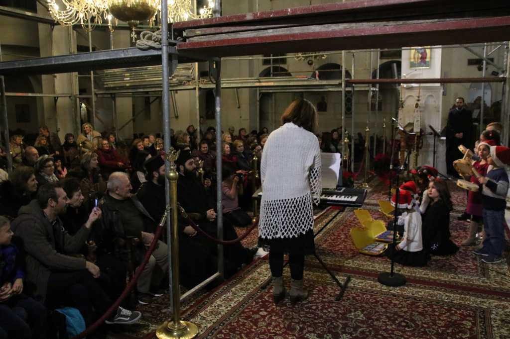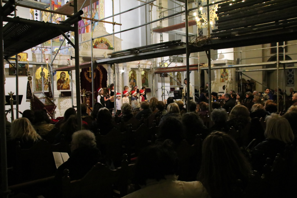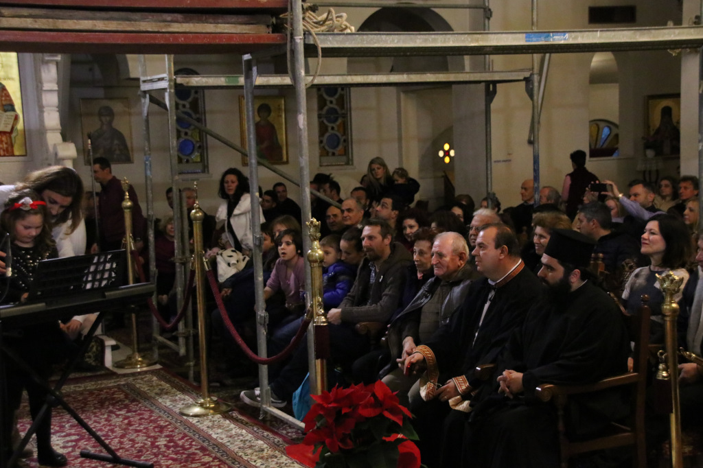 Στον περικαλλή Ιερό Ναό της Αποστολικής Μητροπόλεως της Θεσσαλονίκης και εν μέσω σκαλωσιών που στήθηκαν για την αγιογράφηση του Παντοκράτορα του Τρούλου, η χριστουγεννιάτικη εκδήλωση που παρουσίασε άψογα ο κ. Νίκος Παπαχρήστος, άνοιξε με τις γλυκές φωνές της παιδικής χορωδίας του Ναού «Αγγελικές Φωνές» υπό τη διεύθυνση της κ. Χρύσας Καβάση, η οποία τραγούδησε κάλαντα και χριστουγεννιάτικα τραγούδια.