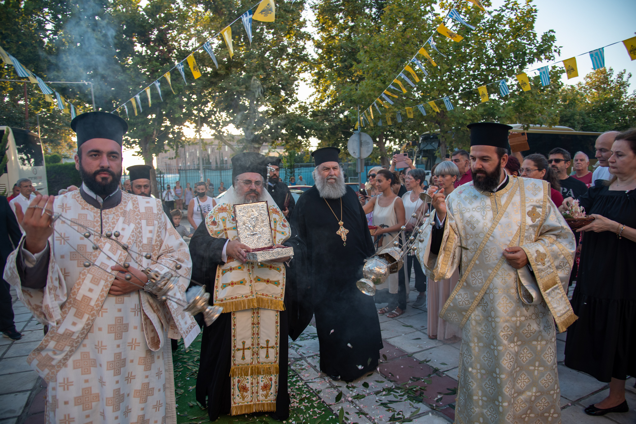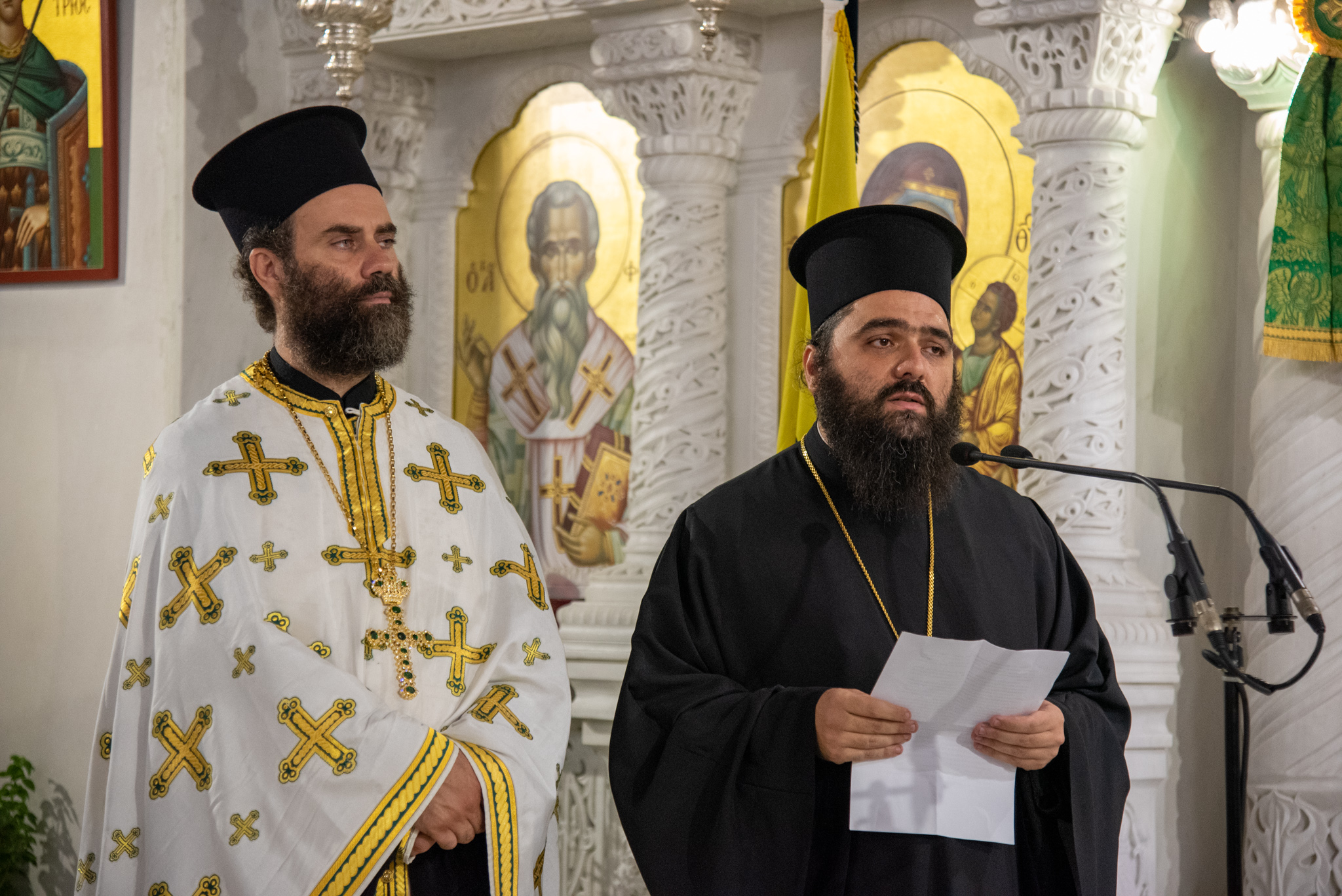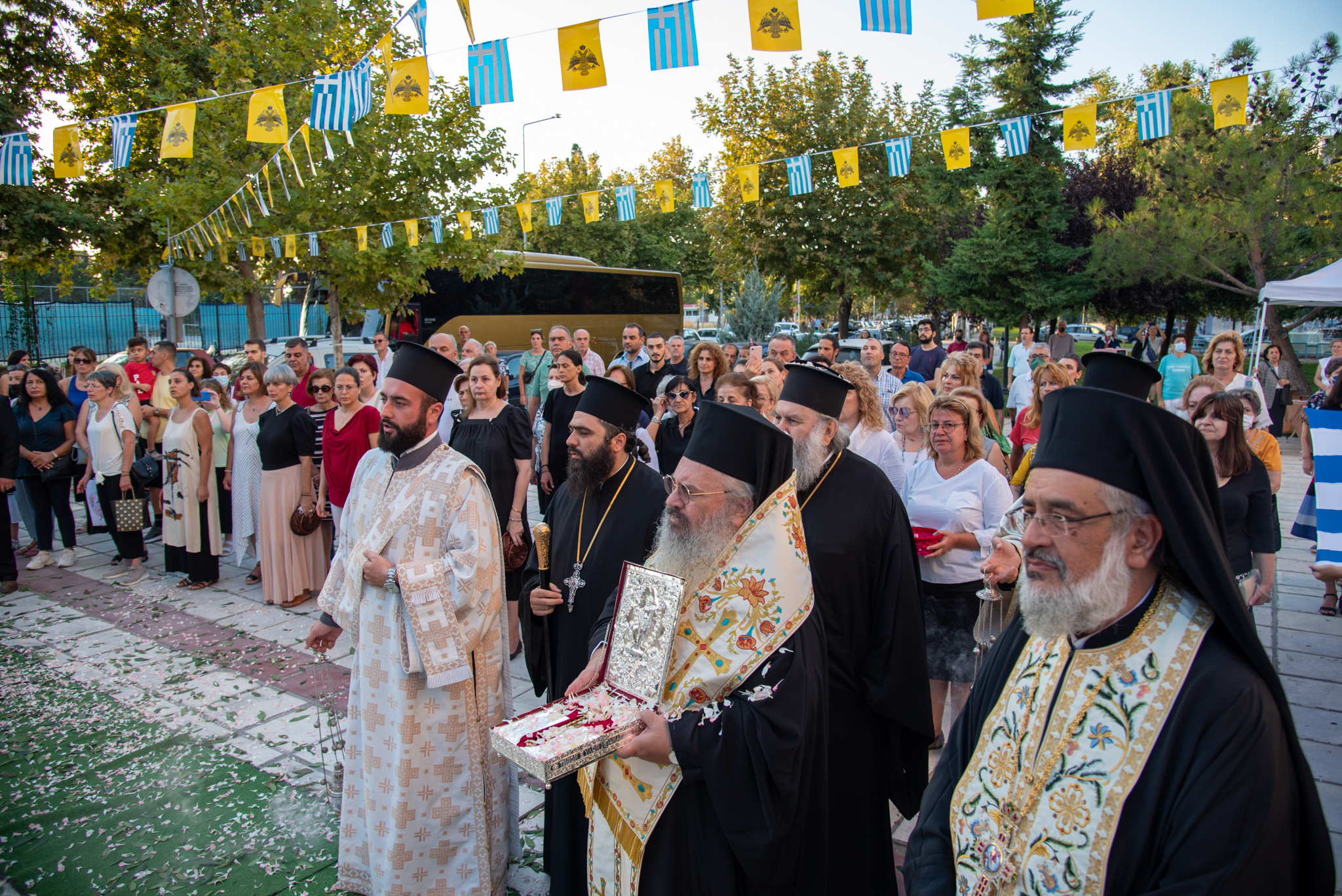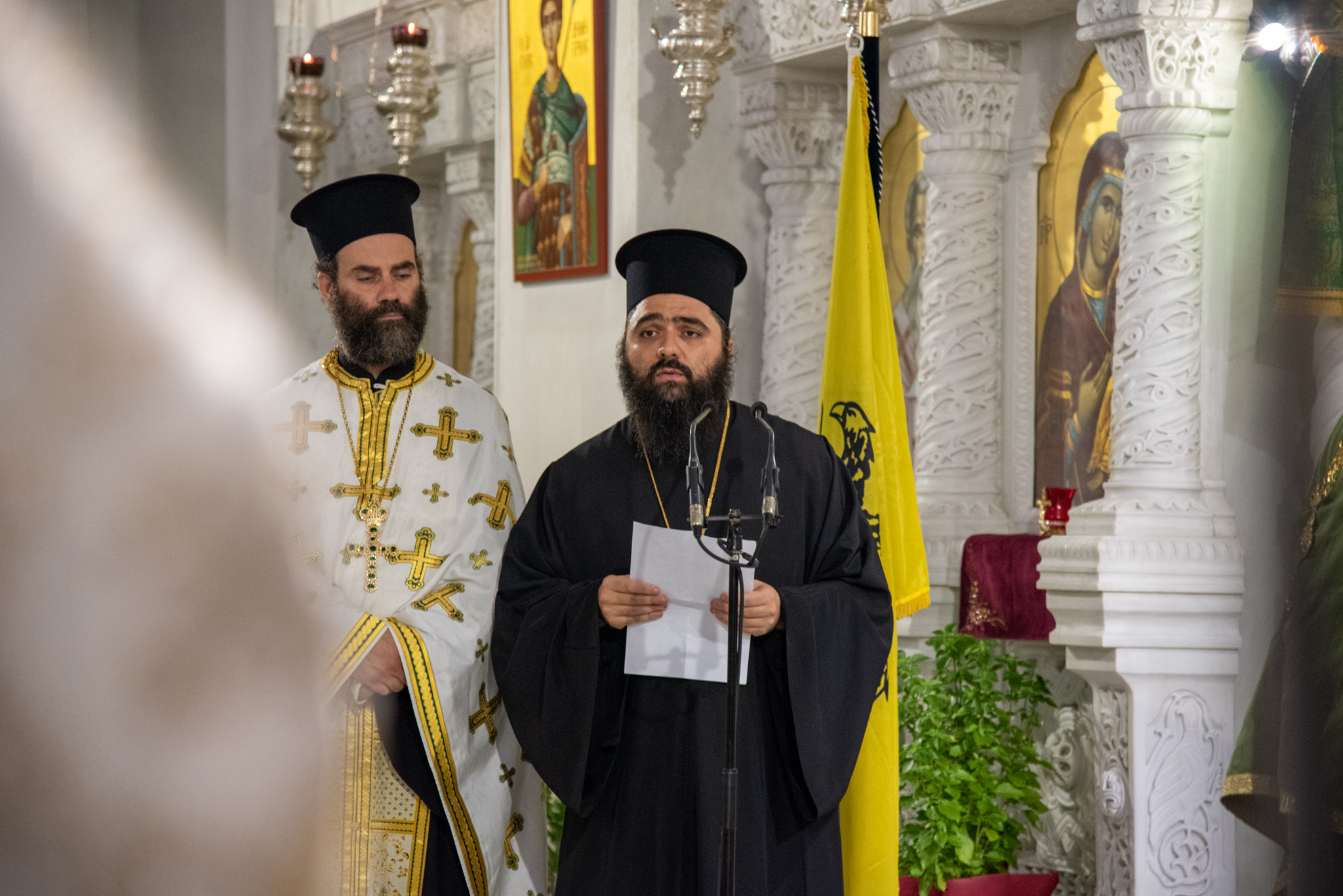 Δηλαδή, ὅλα στόν κόσμο μας, πνευματικά καί ὑλικά, ἔχουν ἀνάγκη ἀπό τόν Τίμιο Σταυρό, ἀπό τό Σφράγισμα τοῦ Σταυροῦ, καί ὁ ἄνθρωπος, καί ἡ φύση, καί ἡ Παιδεία, καί ὁ Πολιτισμός, καί ἡ ζωή, καί ὅλες οἱ λεπτομέρειες τῆς καθημερινότητάς μας!» τόνισε μεταξύ των άλλων ο Προιστάμενος του Ναού Παν. Αρχιμ. Μακάριος Τσιμέρης στην προσφώνησή του και συνέχισε: «Ἔρχεται σήμερα ὁ πρόσφυγας ἀπό τά ματωμένα χώματα της Μικρασίας Σταυρός, τόν ὁποῖο στό προσωπικό του κειμηλιοφυλάκειο, ὡς μαργαρίτη πολύτιμο, διεφύλαξε ὁ Σεβασμιώτατος κ. Πλάτων, καθώς αὔριο τιμοῦμε τή μνήμη τῶν πεσόντων στή γῆ τῆς Ἰωνίας καί θρηνοῦμε τόν ξερριζωμό, τή σφαγή καί τήν προσφυγιά τῶν Μικρασιατῶν πατέρων μας, 100 χρόνια μετά, γιά νά μᾶς θυμίσει τό χρέος μας πρός τήν Ἁγία μας Ἐκκλησία καί τήν φιλτάτη μας πατρίδα, νά διατηρήσουμε ἄσβεστη τή φλόγα τῆς πίστεως καί των πατρώων παραδόσεων, γιά νά ζεστάνουμε τήν ψυχή τῶν συνανθρώπων μας, καί ἰδιαίτερα τῶν νέων μας, πού ἔχει παγώσει ἀπό τό δριμύ ψῦχος τῆς ἀπιστίας, τῆς ἀμφιβολιας, τῆς ὑποκρισίας, τοῦ ἐγωισμοῦ καί τῆς ἁμαρτίας.