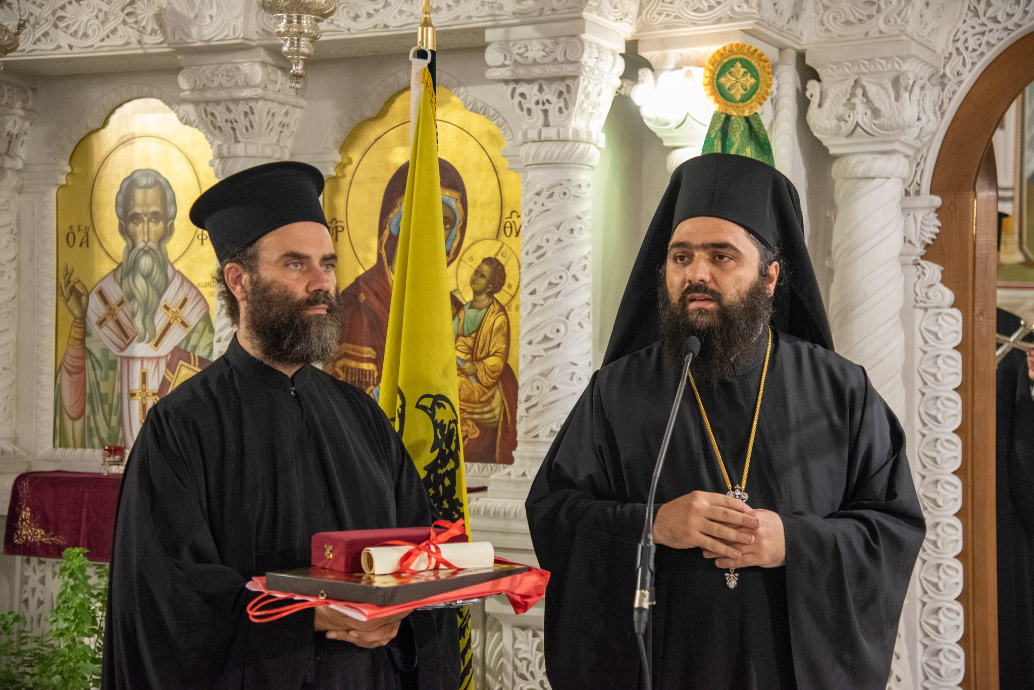 Προ της απολύσεως ο π. Μακάριος, μαζί με τον Εφημέριο Πρωτ. π. Θεοδόσιο Αργυρόπουλο, με ομόφωνη απόφαση του Εκκλησιαστικού Συμβουλίου και την ευλογία του Παναγιωτάτου τίμησε με την ανώτατη διάκριση της Ενορίας, όπως συνηθίζεται πάντα στο πλαίσιο της μεγάλης εορτής της παγκοσμίου Υψώσεως του Τιμίου Σταυρού, τον Πρωτοπρεσβύτερο π. Παλαιολόγο Μάνο, ο οποίος υπηρέτησε ως Προϊστάμενος στον Ναό του Αγίου Φωτίου, και προσέφερε τα μέγιστα στην Ενορία και στο ποίμνιό της, προσφέροντάς του μια Εικόνα με τους Μαρτυρήσαντες Αγίους εν Μικρά Ασία και έναν επιστήθιο Σταυρό.